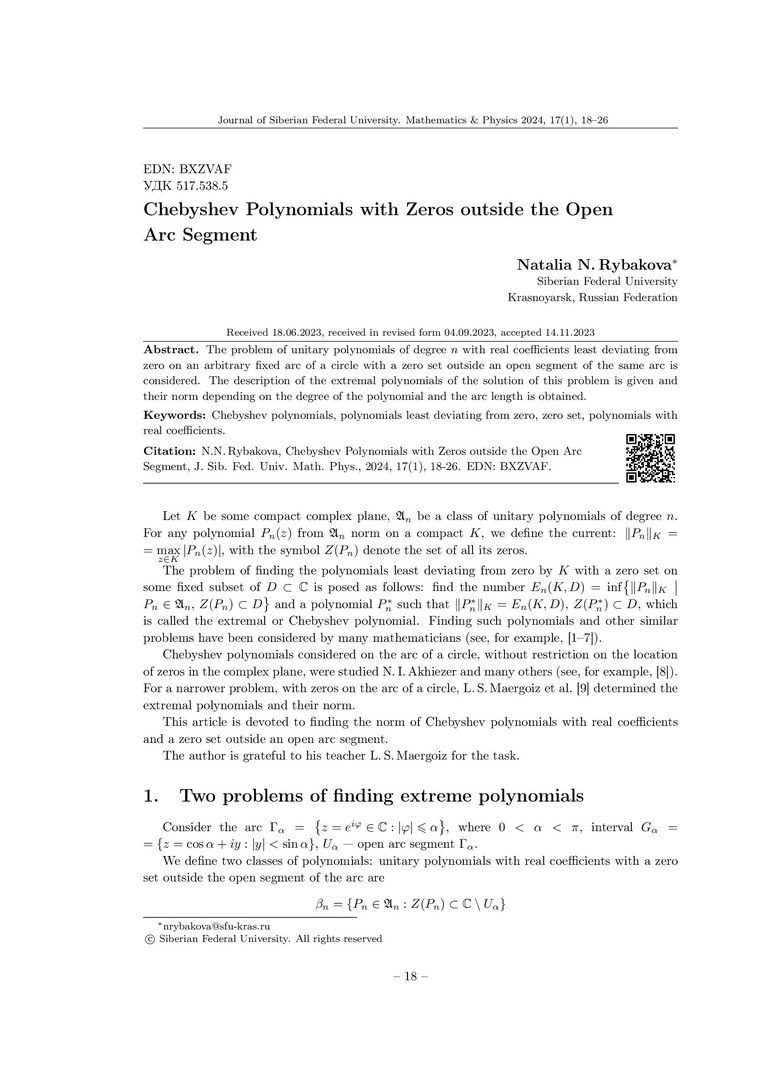 Библиографическое описание:Rybakova, Natalia. Chebyshev Polynomials with Zeros outside the Open Arc Segment = Многочлены Чебышева с нулями вне открытого сегмента дуги / N. N. Rybakova. - Текст : непосредственный // Журнал Сибирского федерального университета. Математика и физика. - 2024. - Т. 17, № 1. - С. 18-26. - Библиогр.: с. 25-26. - ISSN 1997-1397.
