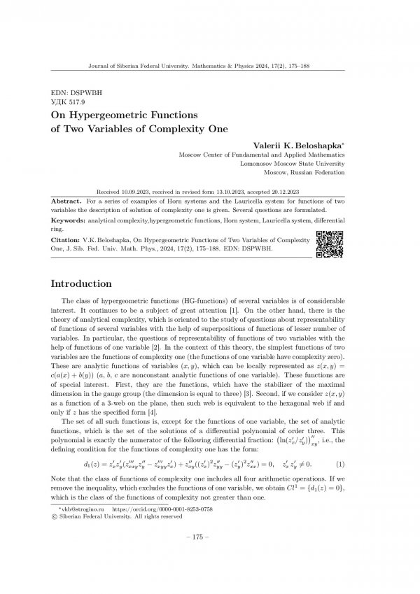Библиографическое описание:Beloshapka, Valerii. On Hypergeometric Functions of Two Variables of Complexity One = О гипергеометрических функциях двух переменных сложности один / V. K. Beloshapka. - Текст : непосредственный // Журнал Сибирского федерального университета. Математика и физика. - 2024. - Т. 17, № 2. - С. 175-188. - Библиогр.: с. 188. - ISSN 1997-1397.