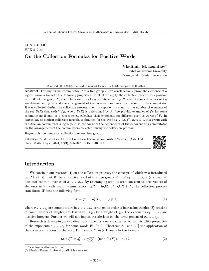 Библиографическое описание:Leontiev, Vladimir. On the Collection Formulas for Positive Words = О собирательных формулах для положительных слов / V. M. Leontiev. - Текст : непосредственный // Журнал Сибирского федерального университета. Математика и физика. - 2024. - Т. 17, № 3. - С. 365-377. - Библиогр.: с. 376-377 . - ISSN 1997-1397.