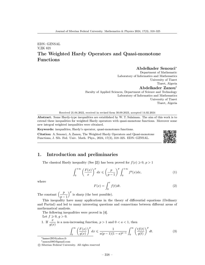 Библиографическое описание:Senouci, Abdelkader. The Weighted Hardy Operators and Quasi-monotone Functions = Весовые операторы Харди и квазимонотонные функции / Abdelkader Senouci, Abdelkader Zanou. - Текст : непосредственный // Журнал Сибирского федерального университета. Математика и физика. - 2024. - Т. 17, № 3. - С. 318-325. - Библиогр.: с. 325. - ISSN 1997-1397.