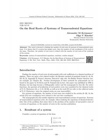 Библиографическое описание:Kytmanov, Alexander. On the Real Roots of Systems of Transcendental Equations = О вещественных корнях систем трансцендентных уравнений / A. M. Kytmanov, O. V. Khodos. - Текст : непосредственный // Журнал Сибирского федерального университета. Математика и физика. - 2024. - Т. 17, № 3. - С. 326-333. - Библиогр.: с. 331-333. - ISSN 1997-1397.