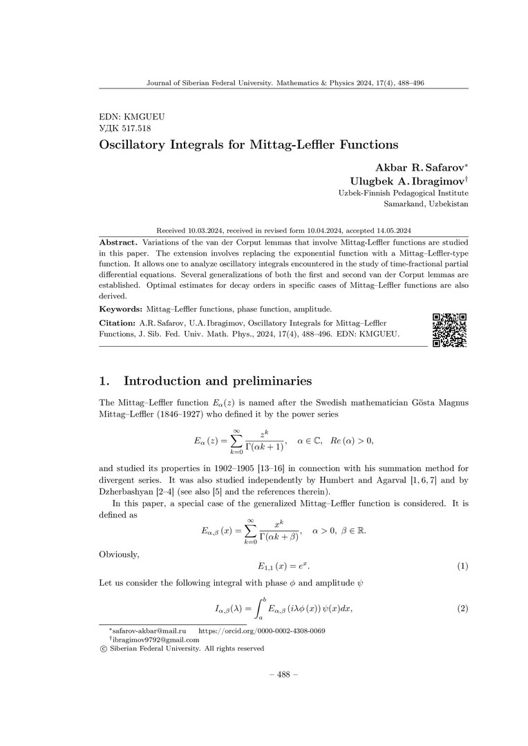Библиографическое описание:Safarov, Akbar. Oscillatory Integrals for Mittag-Leffler Functions = Осциллирующие интегралы для функций Миттаг-Леффлера / A. R. Safarov, U. A. Ibragimov. - Текст : непосредственный // Журнал Сибирского федерального университета. Математика и физика. - 2024. - Т. 17, № 4. - С. 488-496. - Библиогр.: с. 494-496. - ISSN 1997-1397.