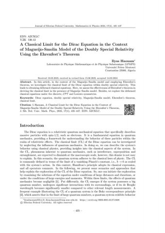 Библиографическое описание:Haouam, Ilyas. A Classical Limit for the Dirac Equation in the Context of Magueijo-Smolin Model of the Doubly Special Relativity Using the Ehrenfest`s Theorem = Классический предел уравнения Дирака в контексте модели Магейхо-Смолина двойной специальной теории относительности с использованием теоремы Эренфеста / Ilyas Haouam. - Текст : непосредственный // Журнал Сибирского федерального университета. Математика и физика. - 2024. - Т. 17, № 4. - С. 435-447. - Библиогр.: с. 444-447. - ISSN 1997-1397.