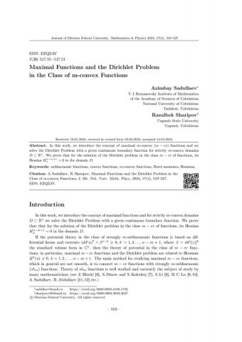 Библиографическое описание:Sadullaev, Azimbay. Maximal Functions and the Dirichlet Problem in the Class of m-convex Functions = Максимальные функции и задача Дирихле в классе m-выпуклых функций / Azimbay Sadullaev, Rasulbek Sharipov. - Текст : непосредственный // Журнал Сибирского федерального университета. Математика и физика. - 2024. - Т. 17, № 4. - С. 519-527. - Библиогр.: с. 526-527. - ISSN 1997-1397.