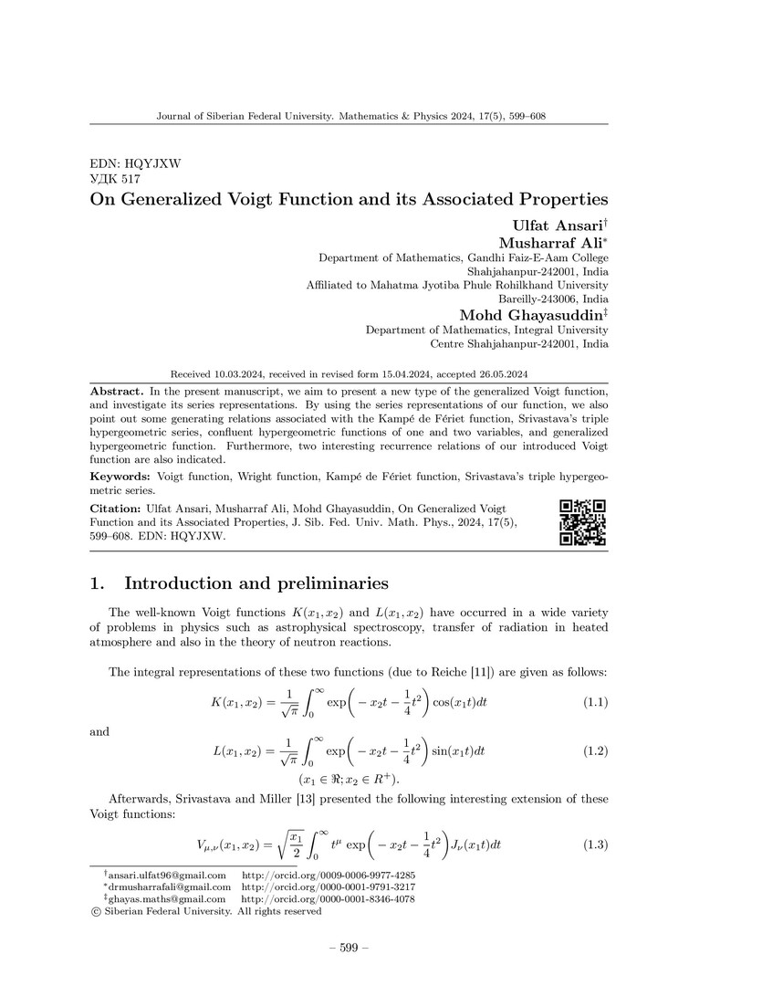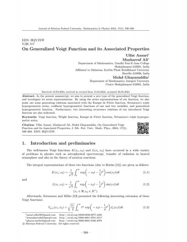 Библиографическое описание:Ulfat Ansari. On Generalized Voigt Function and its Associated Properties = Об обобщенной функции Фойгта и связанных с ней свойствах / Ulfat Ansari, Musharraf Ali, Mohd Ghayasuddin. - Текст : непосредственный // Журнал Сибирского федерального университета. Математика и физика. - 2024. - Т. 17, № 5. - С. 599-608. - Библиогр.: с. 606. - ISSN 1997-1397.