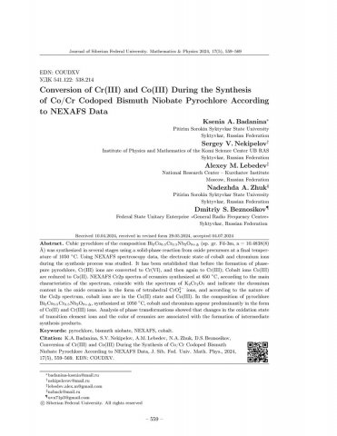 Библиографическое описание:Conversion of Cr(III) and Co(III) During the Synthesis of Co/Cr Codoped Bismuth Niobate Pyrochlore According to NEXAFS Data = Конверсия Cr(III) и Co(III) в процессе синтеза кобальт-хромсодержащего пирохлора на основе ниобата висмута по данным NEXAFS / K. A. Badanina, S. V. Nekipelov, A. M. Lebedev [et al.]. - Текст : непосредственный // Журнал Сибирского федерального университета. Математика и физика. - 2024. - Т. 17, № 5. - С. 559-569. - Библиогр.: с. 566-569. - ISSN 1997-1397.