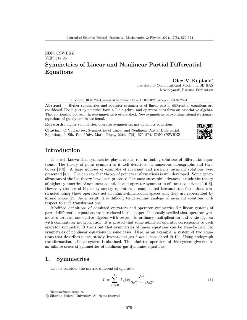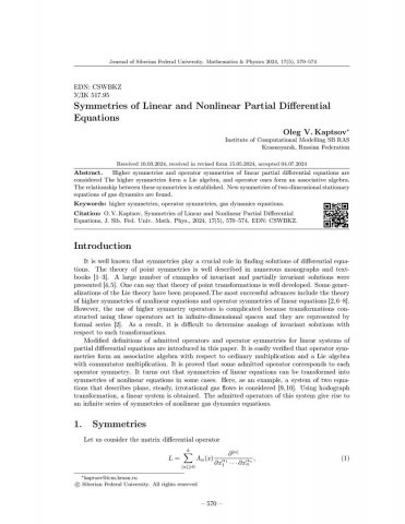 Библиографическое описание:Kaptsov, Oleg. Symmetries of Linear and Nonlinear Partial Differential Equations = Симметрии линейных и нелинейных уравнений с частными производными / O. V. Kaptsov. - Текст : непосредственный // Журнал Сибирского федерального университета. Математика и физика. - 2024. - Т. 17, № 5. - С. 570-574. - Библиогр.: с. 574. - ISSN 1997-1397.