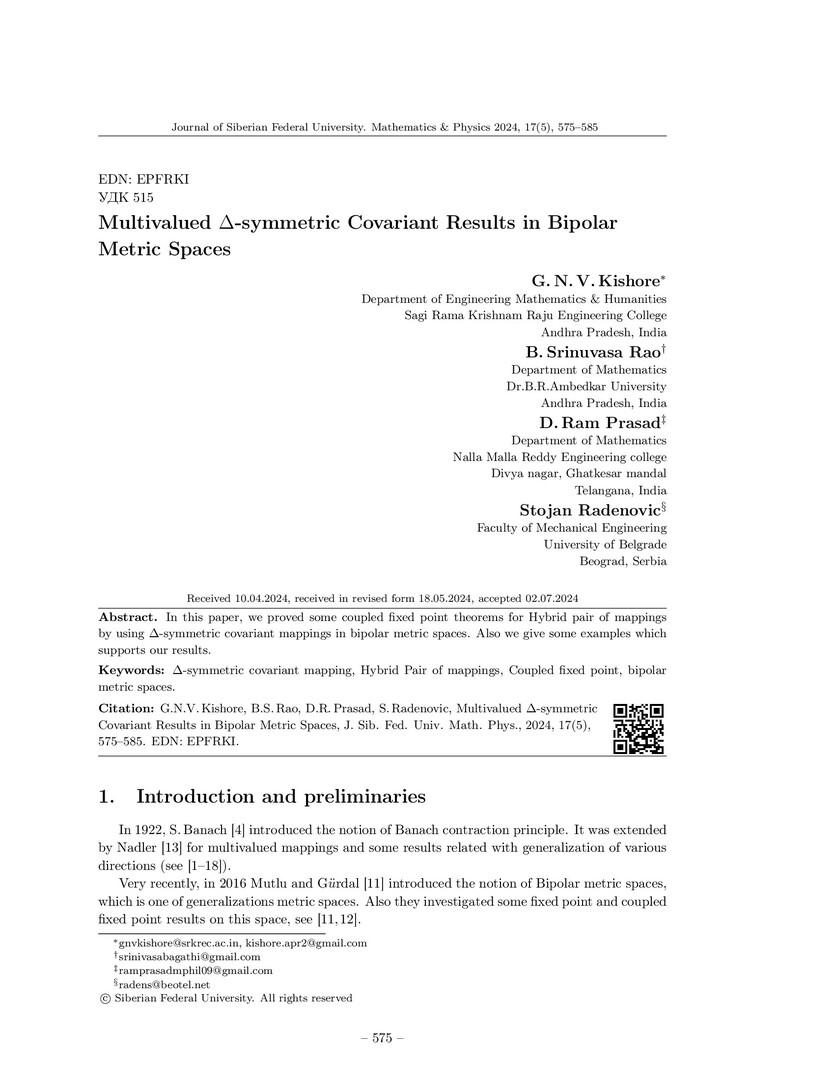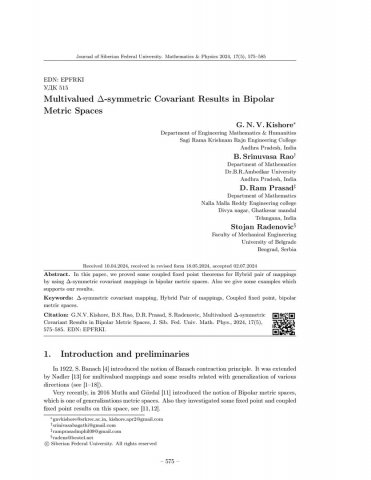 Библиографическое описание:Multivalued дельта-symmetric Covariant Results in Bipolar Metric Spaces = Многозначные дельта-симметричные ковариантные результаты в биполярных метрических пространствах / G. N. V. Kishore, B. Srinuvasa Rao, D. Ram Prasad, Stojan Radenovic. - Текст : непосредственный // Журнал Сибирского федерального университета. Математика и физика. - 2024. - Т. 17, № 5. - С. 575-585. - Библиогр.: с. 584-585. - ISSN 1997-1397.