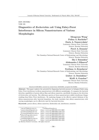 Библиографическое описание:Diagnostics of Escherichia coli Using Fabry-Perot Interference in Silicon Nanostructures of Various Morphologies = Диагностика Escherichia coli с помощью интерференции Фабри-Перо в кремниевых наноструктурах различной морфологии / Mengyuan Wang Rachishe Nazarovskaia [et al.]. - Текст : непосредственный // Журнал Сибирского федерального университета. Математика и физика. - 2024. - Т. 17, № 6. - С. 798-807. - Библиогр.: с. 804-807. - ISSN 1997-1397.