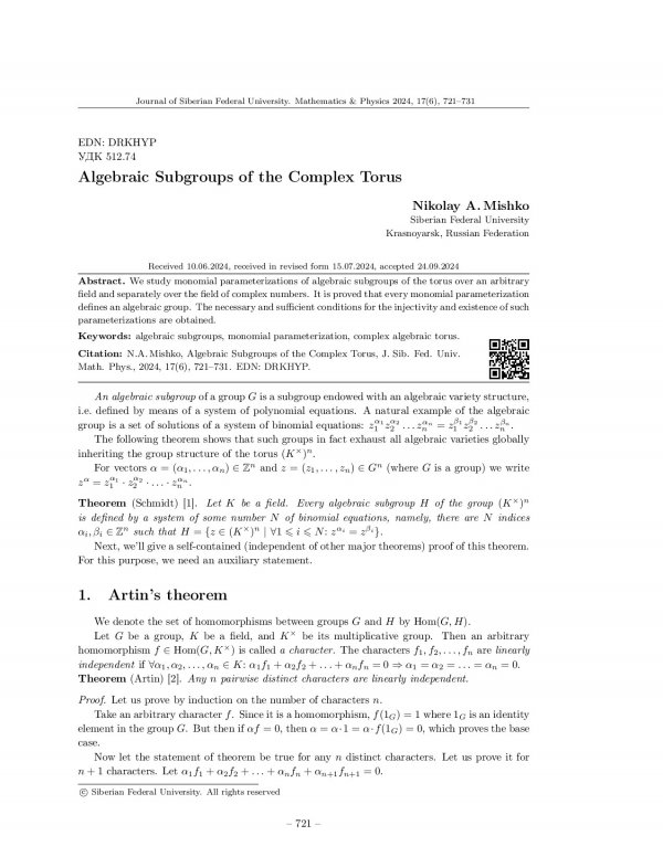 Аннотация:В работе изучаются мономиальные параметризации алгебраических подгрупп тора над произвольным полем и отдельно над полем комплексных чисел.
