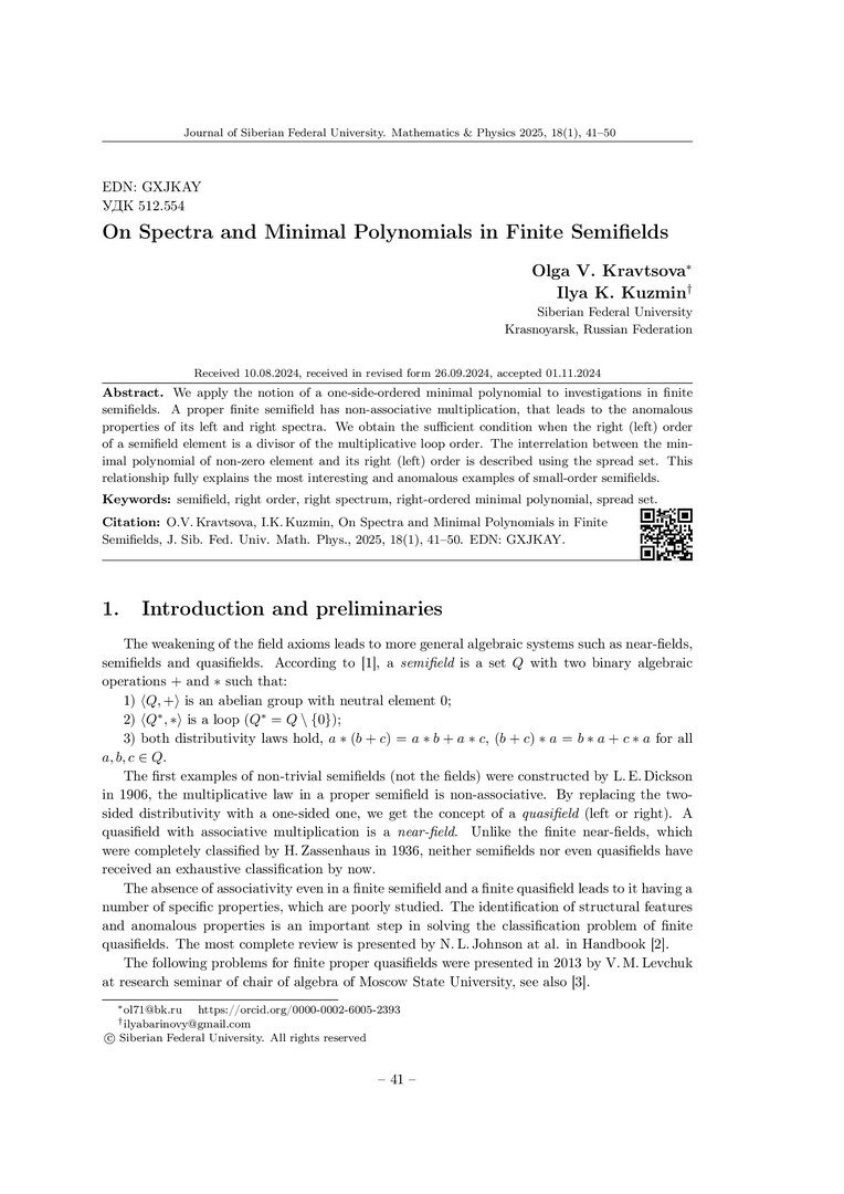 Библиографическое описание:Kravtsova, Olga. On Spectra and Minimal Polynomials in Finite Semifields = О спектрах и минимальных многочленах в конечных полуполях / O. V. Kravtsova, I. K. Kuzmin. - Текст : непосредственный // Журнал Сибирского федерального университета. Математика и физика. - 2025. - Т. 18, № 1. - С. 41-50. - Библиогр.: с. 49-50. - ISSN 1997-1397.