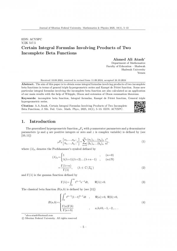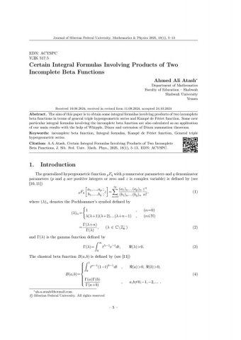 Библиографическое описание:Ahmed Ali Atash. Certain Integral Formulas Involving Products of Two Incomplete Beta Functions = Некоторые интегральные формулы, включающие произведения двух неполных бета-функций / Ahmed Ali Atash. - Текст : непосредственный // Журнал Сибирского федерального университета. Математика и физика. - 2025. - Т. 18, № 1. - С. 5-13. - Библиогр.: с. 12-13. - ISSN 1997-1397.