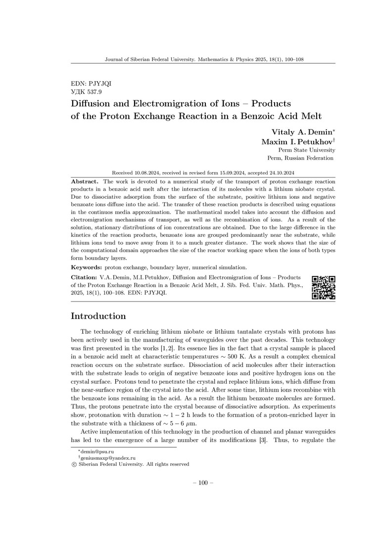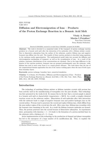 Библиографическое описание:Demin, Vitaly. Diffusion and Electromigration of Ions – Products of the Proton Exchange Reaction in a Benzoic Acid Melt = Диффузия и электромиграция ионов – продуктов реакции протонного обмена в расплаве бензойной кислоты / V. A. Demin, M. I. Petukhov. - Текст : непосредственный // Журнал Сибирского федерального университета. Математика и физика. - 2025. - Т. 18, № 1. - С. 100-108. - Библиогр.: с. 107-108. - ISSN 1997-1397.