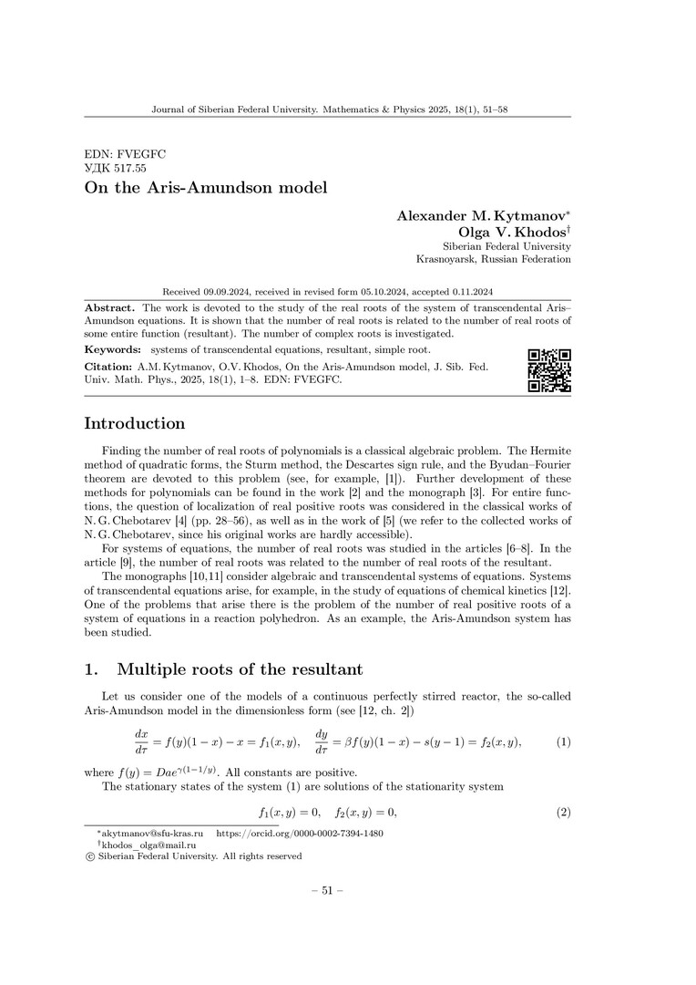 Библиографическое описание:Kytmanov, Alexander. On the Aris-Amundson model = О модели Ариса-Амундсона / A. M. Kytmanov, O. V. Khodos. - Текст : непосредственный // Журнал Сибирского федерального университета. Математика и физика. - 2025. - Т. 18, № 1. - С. 51-58. - Библиогр.: с. 57-58. - ISSN 1997-1397.