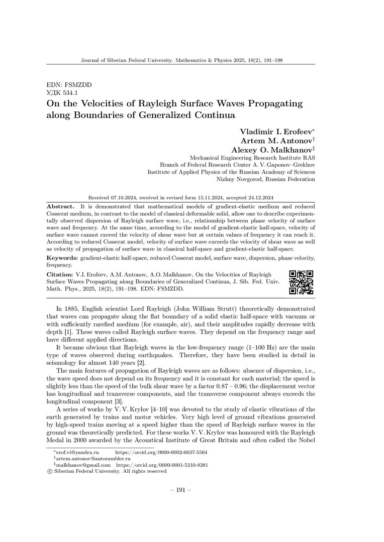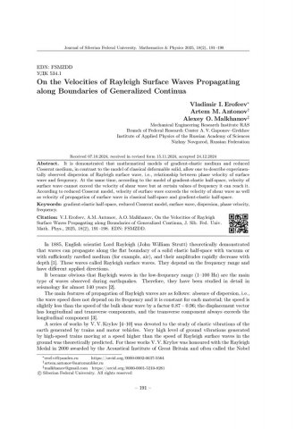 Библиографическое описание:Erofeev, Vladimir. On the Velocities of Rayleigh Surface Waves Propagating along Boundaries of Generalized Continua = О скоростях поверхностных волн Рэлея, распространяющихся вдоль границ обобщенных континуумов / V. I. Erofeev, A. M. Antonov, A. O. Malkhanov. - Текст : непосредственный // Журнал Сибирского федерального университета. Математика и физика. - 2025. - Т. 18, № 2. - С. 191-198. - Библиогр.: с. 196-198. - ISSN 1997-1397.