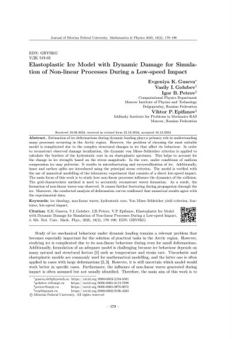 Библиографическое описание:Elastoplastic Ice Model with Dynamic Damage for Simula- tion of Non-linear Processes During a Low-speed Impact = Упругопластическая модель льда с динамическим разрушением для моделирования нелинейных процессов во время низкоскоростного удара / E. K. Guseva, V. I. Golubev, I. B. Petrov, V. P. Epifanov. - Текст : непосредственный // Журнал Сибирского федерального университета. Математика и физика. - 2025. - Т. 18, № 2. - С. 179-190. - Библиогр.: с. 188-190. - ISSN 1997-1397.