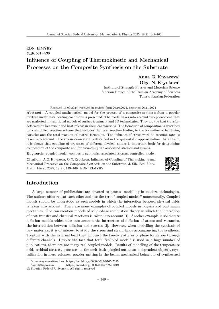Библиографическое описание:Knyazeva, Anna. Influence of Coupling of Thermokinetic and Mechanical Processes on the Composite Synthesis on the Substrate = Влияние связанности термокинетических и механических процессов на синтез композита на подложке / A. G. Knyazeva, O. N. Kryukova. - Текст : непосредственный // Журнал Сибирского федерального университета. Математика и физика. - 2025. - Т. 18, № 2. - С. 149-160. - Библиогр.: с. 158-160. - ISSN 1997-1397.