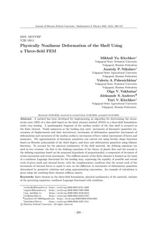 Библиографическое описание:Physically Nonlinear Deformation of the Shell Using a Three-field FEM = Физически нелинейное деформирование оболочки при использовании трехпольного МКЭ / Mikhail Yu. Klochkov Nikolaev Pshenichkina [et al.]. - Текст : непосредственный // Журнал Сибирского федерального университета. Математика и физика. - 2025. - Т. 18, № 2. - С. 209-217. - Библиогр.: с. 216-217. - ISSN 1997-1397.