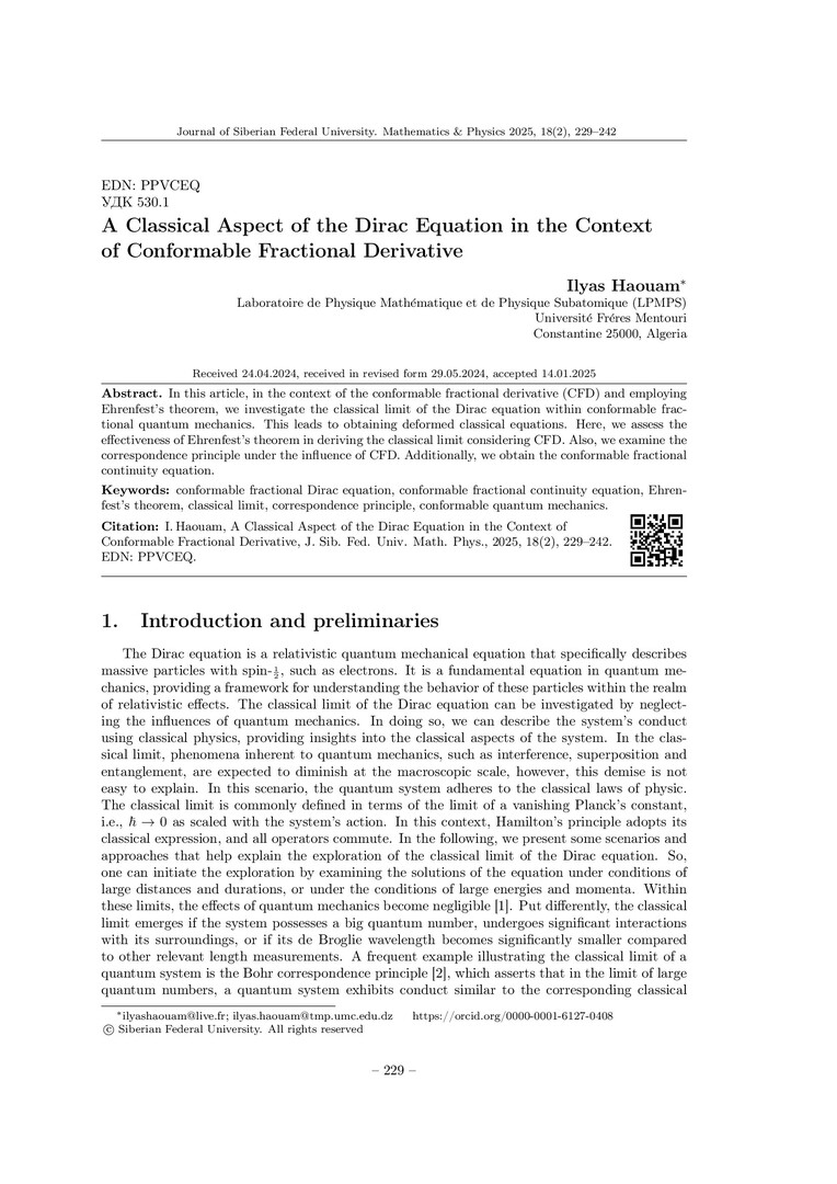Библиографическое описание:Ilyas Haouam. A Classical Aspect of the Dirac Equation in the Context of Conformable Fractional Derivative = Классический аспект уравнения Дирака в контексте согласованной дробной производной / Ilyas Haouam. - Текст : непосредственный // Журнал Сибирского федерального университета. Математика и физика. - 2025. - Т. 18, № 2. - С. 229-242. - Библиогр.: с. 239-242. - ISSN 1997-1397.