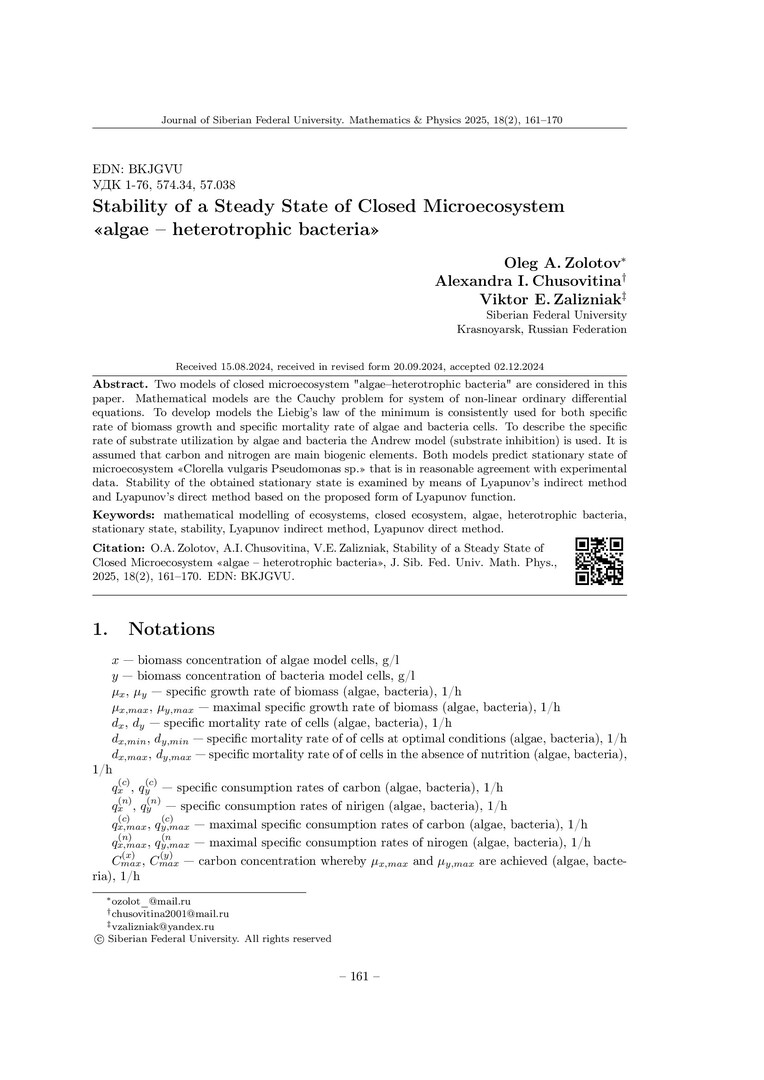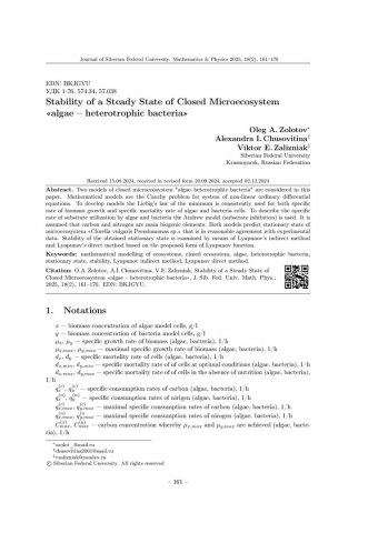 Библиографическое описание:Zolotov, Oleg. Stability of a Steady State of Closed Microecosystem "algae – heterotrophic bacteria" = Устойчивость стационарного состояния замкнутой микроэкосистемы "одноклеточная водоросль – гетеротрофная бактерия" / O. A. Zolotov, A. I. Chusovitina, V. E. Zalizniak. - Текст : непосредственный // Журнал Сибирского федерального университета. Математика и физика. - 2025. - Т. 18, № 2. - С. 161-170. - Библиогр.: с. 169-170. - ISSN 1997-1397.