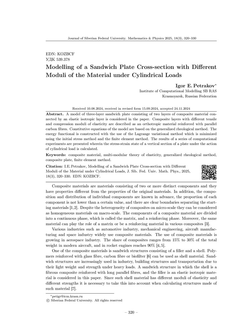 Библиографическое описание:Petrakov, Igor. Modelling of a Sandwich Plate Cross-section with Different Moduli of the Material under Cylindrical Loads = Моделирование сечения сэндвич-пластины при цилиндрических нагрузках с учетом разномодульности материала / I. E. Petrakov. - Текст : непосредственный // Журнал Сибирского федерального университета. Математика и физика. - 2025. - Т. 18, № 3. - С. 320-330. - Библиогр.: с. 328-330. - ISSN 1997-1397.