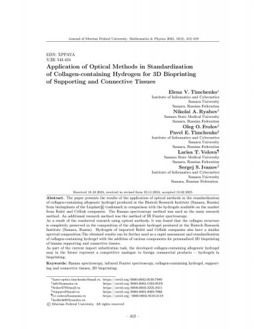 Библиографическое описание:Application of Optical Methods in Standardization of Collagen-containing Hydrogen for 3D Bioprinting of Supporting and Connective Tissues = Применение оптических методов в стандартизации коллагенсодержащего гидрогеля для 3D-биопечати опорных и соединительных тканей / E. V. Timchenko, N. A. Ryabov, O. O. Frolov [et al.]. - Текст : непосредственный // Журнал Сибирского федерального университета. Математика и физика. - 2025. - Т. 18, № 3. - С. 412-419. - Библиогр.: с. 418-419. - ISSN 1997-1397.