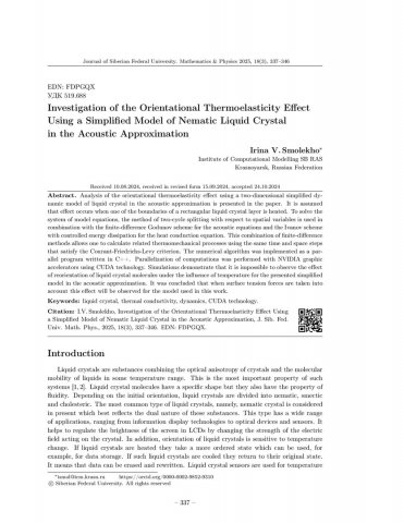 Библиографическое описание:Smolekho, Irina. Investigation of the Orientational Thermoelasticity Effect Using a Simplified Model of Nematic Liquid Crystal in the Acoustic Approximation = Исследование эффекта ориентационной термоупругости с помощью упрощенной модели нематического жидкого кристалла в акустическом приближении / I. V. Smolekho. - Текст : непосредственный // Журнал Сибирского федерального университета. Математика и физика. - 2025. - Т. 18, № 3. - С. 337-346. - Библиогр.: с. 345-346. - ISSN 1997-1397.
