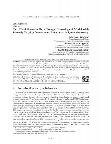 Библиографическое описание:Mandala Krishna. Two Fluid Scenario Dark Energy Cosmological Model with Linearly Varying Deceleration Parameter in Lyra’s Geometry = Двухжидкостный сценарий космологической модели темной энергии с линейно изменяющимся параметром замедления в геометрии Лиры / Mandala Krishna, SobhanBabu Koppala, Santhikumar Rajamahanthi. - Текст : непосредственный // Журнал Сибирского федерального университета. Математика и физика. - 2025. - Т. 18, № 4. - С. 519-531. - Библиогр.: с. 527-531. - ISSN 1997-1397.