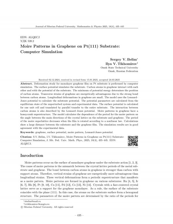 Библиографическое описание:Belim, Sergey. Moire Patterns in Graphene on Pt(111) Substrate: Computer Simulation = Муаровые узоры в графене на подложке Pt(111): компьютерное моделирование / S. V. Belim, I. V. Tikhomirov. - Текст : непосредственный // Журнал Сибирского федерального университета. Математика и физика. - 2025. - Т. 18, № 4. - С. 435-445. - Библиогр.: с. 442-445. - ISSN 1997-1397.