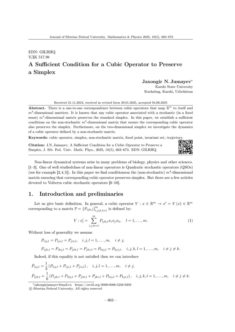 Библиографическое описание:Jumayev, Jaxongir. A Sufficient Condition for a Cubic Operator to Preserve a Simplex = Достаточное условие кубического оператора для сохранения симплекса / J. N. Jumayev. - Текст : непосредственный // Журнал Сибирского федерального университета. Математика и физика. - 2025. - Т. 18, № 5. - С. 663-673. - Библиогр.: с. 672-673. - ISSN 1997-1397.