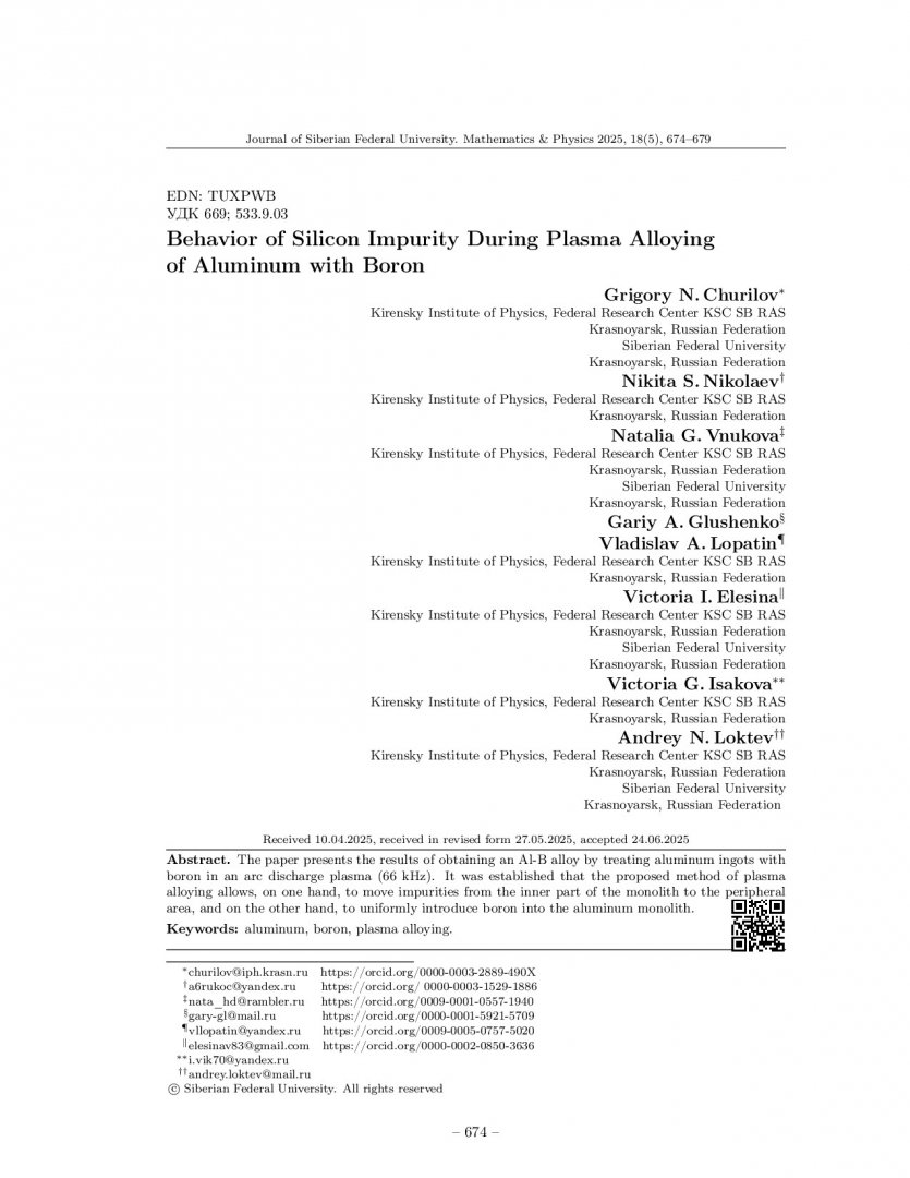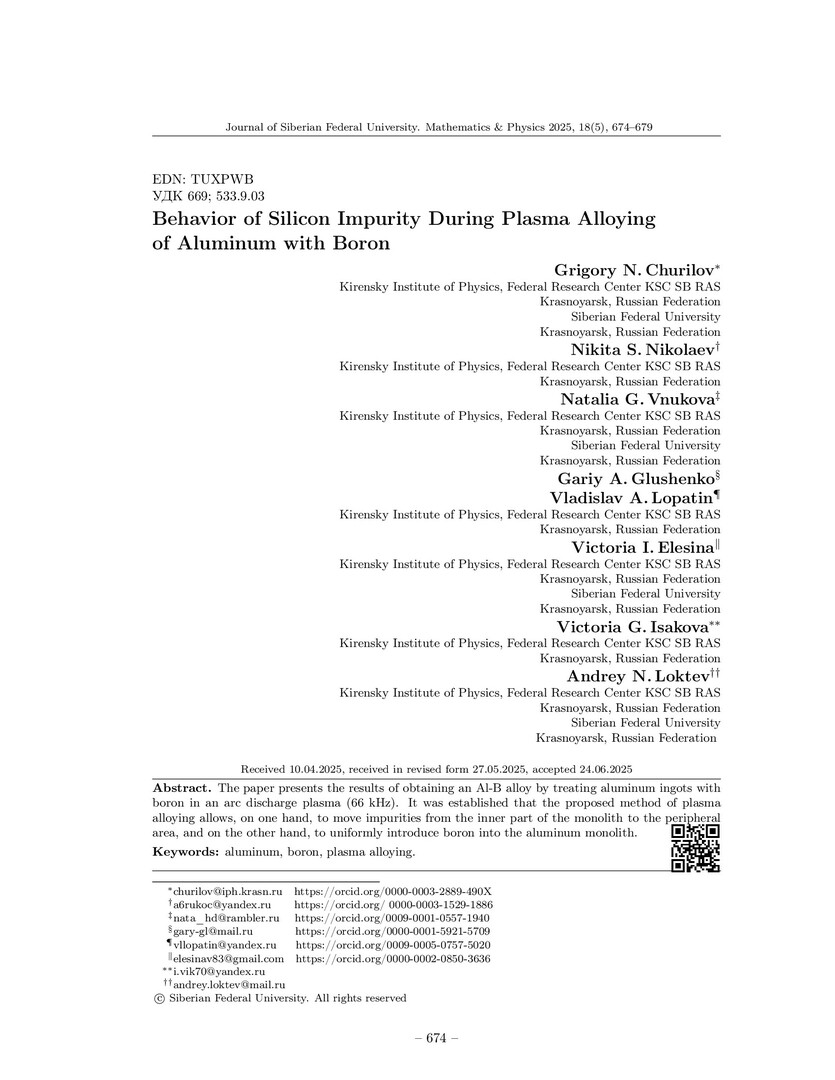 Библиографическое описание:Behavior of Silicon Impurity During Plasma Alloying of Aluminum with Boron = Поведение примеси кремния в процессе плазменного легирования алюминия бором / G. N. Churilov, N. S. Nikolaev, N. G. Vnukova [et al.]. - Текст : непосредственный // Журнал Сибирского федерального университета. Математика и физика. - 2025. - Т. 18, № 5. - С. 674-679. - Библиогр.: с. 677-679. - ISSN 1997-1397.