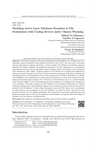 Библиографическое описание:Filimonov, Mikhail. Modeling Active Layer Thickness Dynamics in Pile Foundations with Cooling Devices under Climate Warming = Моделирование динамики сезонного промерзания-оттаивания грунта в свайных фундаментах с охлаждающими устройствами при потеплении климата / Mikhail Yu. Filimonov, N. A. Vaganova, V. M. Kapkaev. - Текст : непосредственный // Журнал Сибирского федерального университета. Математика и физика. - 2025. - Т. 18, № 5. - С. 605-616. - Библиогр.: с. 614-616. - ISSN 1997-1397.