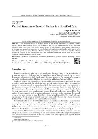 Аннотация:В настоящей работе определена вертикальная структура внутренних сейш в стратифицированном озере (Шира, Хакасия, Восточная Сибирь).