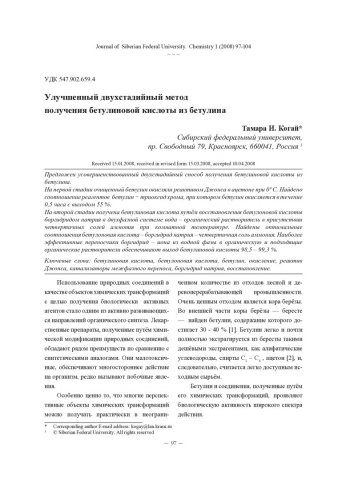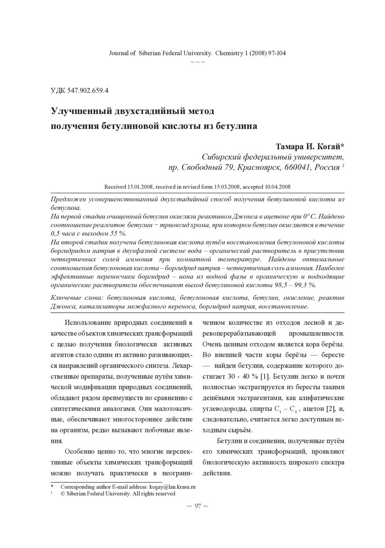 Библиографическое описание:Когай, Т. И. Улучшенный двухстадийный метод получения бетулиновой кислоты из бетулина = Improved Two-stage Method of Manufacturing Betulinic Acid from Betulin / Т. И. Когай. - Текст : непосредственный // Журнал Сибирского федерального университета. Химия. - 2008. - Т. 1, № 1. - С. 97-104. - Библиогр.: с. 103 (13 назв.). - ISSN 1998-2836.