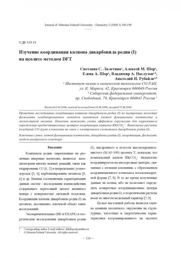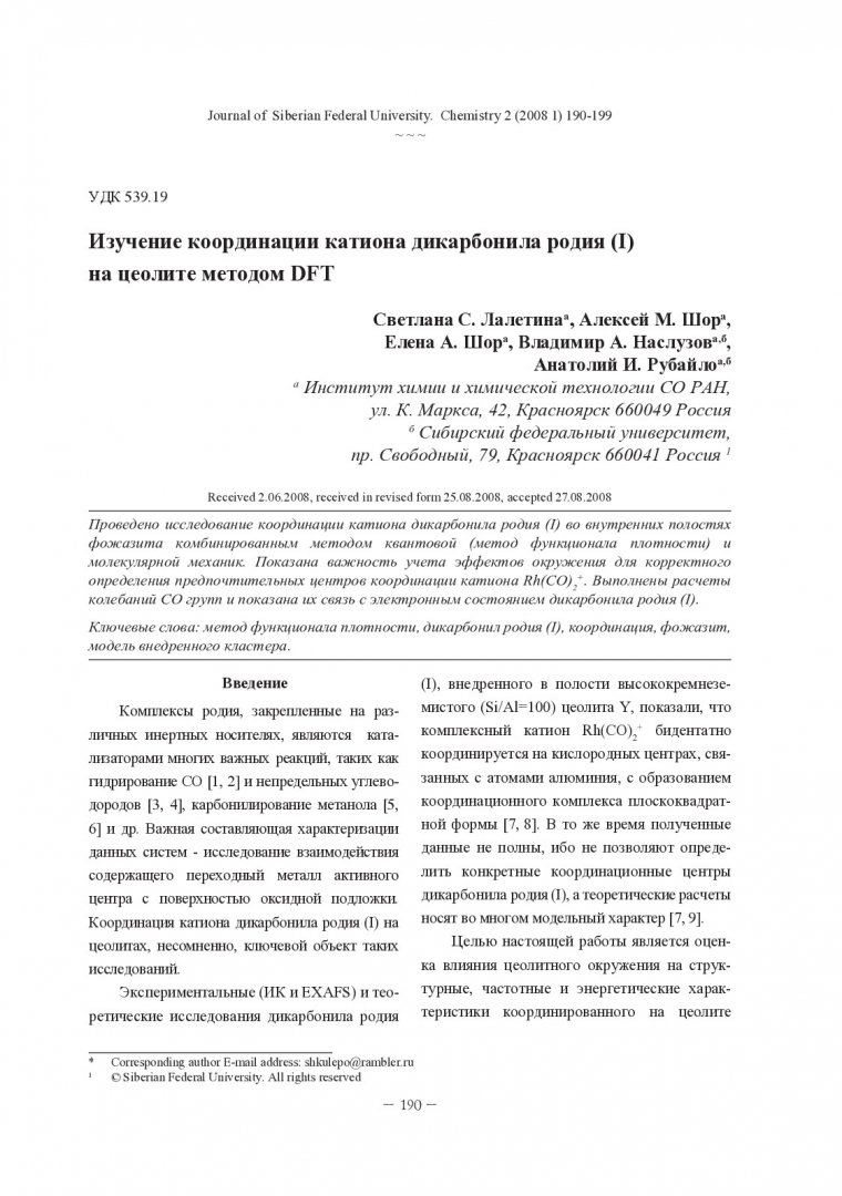 Библиографическое описание:Изучение координации катиона дикарбонила родия (I) на цеолите методом DFT = The Study of Rhodium (I) Dicarbonyl Coordination in Faujasite Cavities by DFT-method / С. С. Лалетина, А. М. Шор, Е. А. Шор [и др.]. - Текст : непосредственный // Журнал Сибирского федерального университета. Химия. - 2008. - Т. 1, № 2. - С. 190-199. - Библиогр.: с. 197-198 (21 назв.). - ISSN 1998-2836.