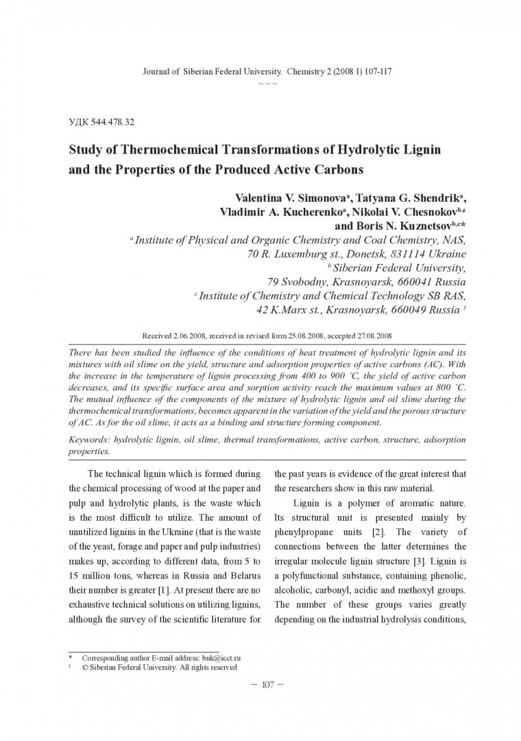 Библиографическое описание:Study of Thermochemical Transformations of Hydrolytic Lignin and the Properties of the Produced Active Carbons = Изучение термохимических превращений гидролитического лигнина и свойств получаемых активных углей / V. V. Simonova, T. G. Shendrik, V. A. Kucherenko [et al.]. - Текст : непосредственный // Журнал Сибирского федерального университета. Химия. - 2008. - Т. 1, № 2. - С. 107-117. - Библиогр.: с. 116-117 (20 назв.). - ISSN 1998-2836.