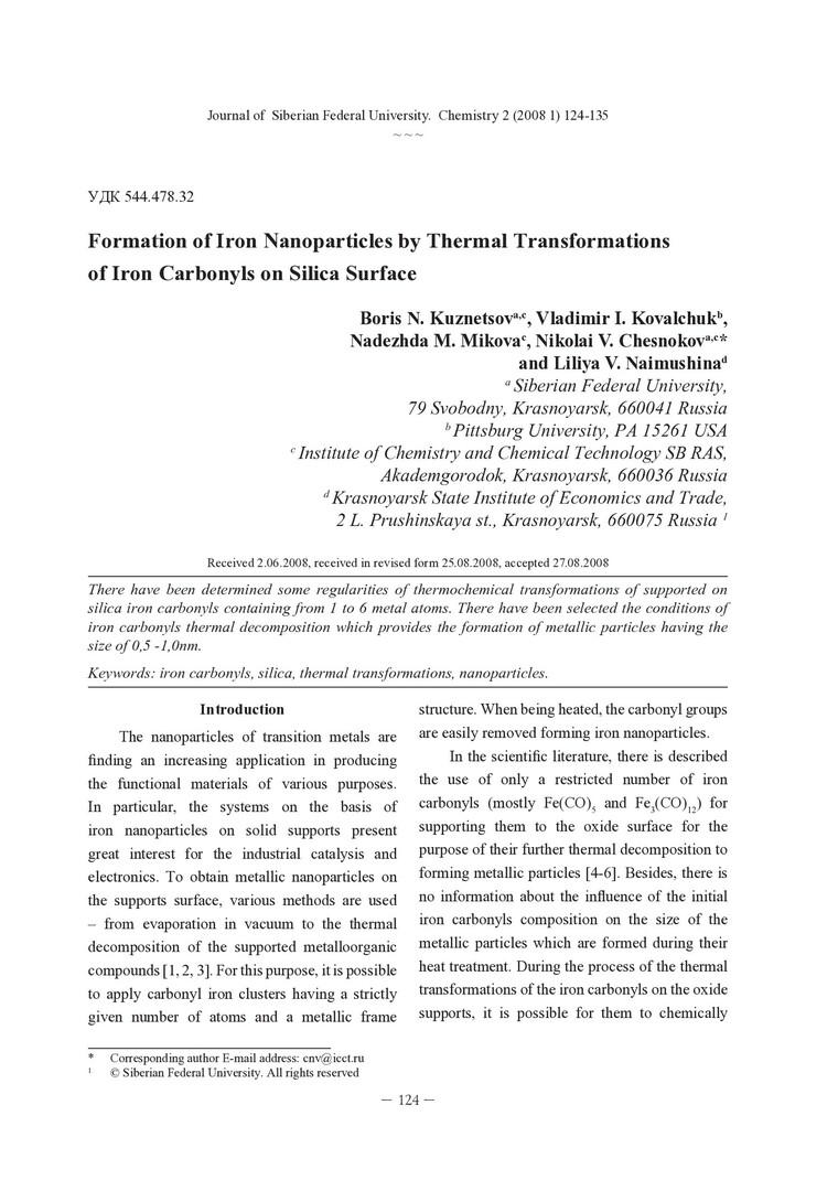 Библиографическое описание:Formation of Iron Nanoparticles by Thermal Transformations of Iron Carbonyls on Silica Surface = Образование наночастиц железа при термических преобразованиях карбонилов железа на поверхности кремния / B. N. Kuznetsov, V. I. Kovalchuk, N. M. Mikova [et al.]. - Текст : непосредственный // Журнал Сибирского федерального университета. Химия. - 2008. - Т. 1, № 2. - С. 124-135. - Библиогр.: с. 134-135 (19 назв.). - ISSN 1998-2836.