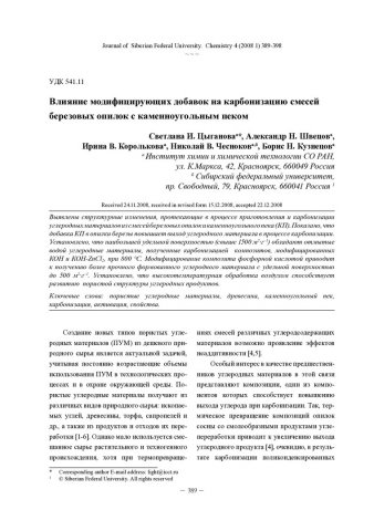 Аннотация:Выявлены структурные изменения, протекающие в процессе приготовления и карбонизации углеродных материалов из смесей березовых опилок и каменноугольного пека (КП). Показано, что добавка КП в опилки березы повышает выход углеродного материала в процессе карбонизации.