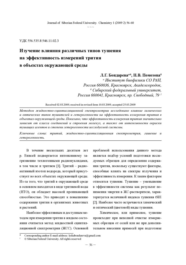 Библиографическое описание:Бондареваа, Л. Г. Изучение влияния различных типов тушения на эффективность измерений трития в объектах окружающей среды = Investigation of the influence of various quenching types on efficiency of measuring tritium in environmental objects / Л. Г. Бондареваа, Н. В. Помозова. - Текст : непосредственный // Журнал Сибирского федерального университета. Химия. - 2009. - Т. 2, № 1. - С. 56-60. - Библиогр.: с. 60 (5 назв.). - ISSN 1998-2836.