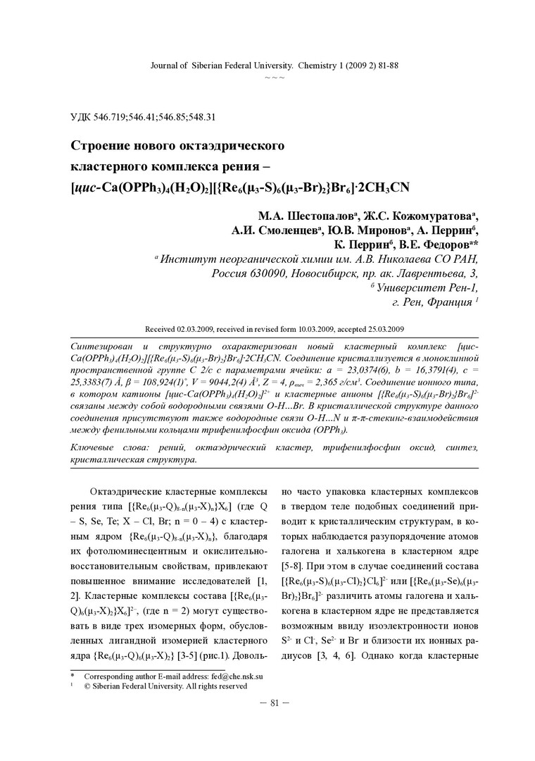 Библиографическое описание:Строение нового октаэдрического кластерного комплекса рения - [цис-Ca(OPPh[3])[4](H[2]O)[2]][{Re[6](мю-S)[6](мю[3]-Br)[2]}Br[6]]·[2]CH[3]CN = Structure of the new octahedral rhenium cluster complexes - [cis-Ca(OPPh[3])[4](H[2]O)[2]][{Re[6](мю[3]-S)[6](мю[3]-Br)[2]}Br[6]]·[2]CH[3]CN / М. А. Шестопалов, Ж. С. Кожомуратова, А. И. Смоленцев [и др.]. - Текст : непосредственный // Журнал Сибирского федерального университета. Химия. - 2009. - Т. 2, № 1. - С. 81-88. - Библиогр.: с. 86-88 (20 назв.). - ISSN 1998-2836.