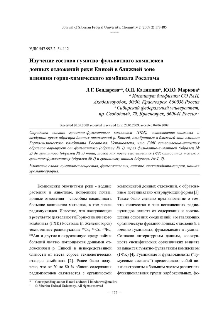 Библиографическое описание:Бондарева, Л. Г. Изучение состава гуматно-фульватного комплекса донных отложений реки Енисей в ближней зоне влияния горно-химического комбината Росатома = Investigation of the composition of the humate-fulvate complex in the Yenisei river sediments from the near zone affected by the operation of the mining-and-chemical combine of the Russian agency of atomic energy / Л. Г. Бондарева, О. П. Калякина, Ю. Ю. Маркова. - Текст : непосредственный // Журнал Сибирского федерального университета. Химия. - 2009. - Т. 2, № 2. - С. 177-185. - Библиогр.: с. 184-185 (11 назв.). - ISSN 1998-2836.