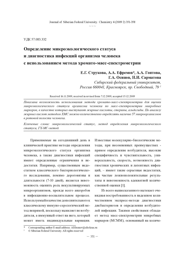 Библиографическое описание:Определение микроэкологического статуса и диагностика инфекций организма человека с использованием метода хромато-масс-спектрометрии = Definition of the Microecological Status and Diagnosis of the Human's Infections, using the Method of Chromatography-Mass Spectrometry / Е. Г. Струкова, А. А. Ефремов, А. А. Гонтова [и др.]. - Текст : непосредственный // Журнал Сибирского федерального университета. Химия. - 2009. - Т. 2, № 4. - С. 351-358. - Библиогр.: с. 357 (9 назв.). - ISSN 1998-2836.