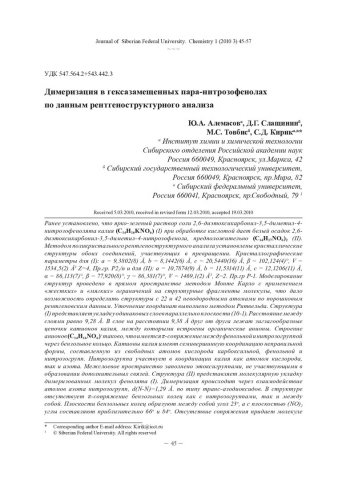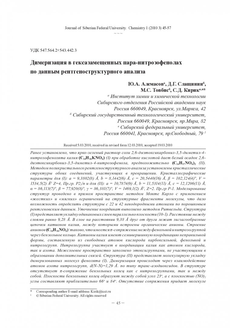 Библиографическое описание:Димеризация в гексазамещенных пара-нитрозофенолах по данным рентгеноструктурного анализа = Dimerization in Hexasubstituted Para-Nitrosophenols by X-Ray Powder Diffraction Analysis / Ю. А. Алемасов, Д. Г. Слащинин, М. С. Товбис, С. Д. Кирик. - Текст : непосредственный // Журнал Сибирского федерального университета. Химия. - 2010. - Т. 3, № 1. - С. 45-57. - Библиогр.: с. 55-56 (19 назв.). - ISSN 1998-2836.