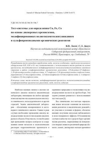 Тест-системы для определения Cu, Fe, Co на основе дисперсных кремнеземов, модифицированных полигексаметиленгуанидином и сульфопроизводными органических реагентов