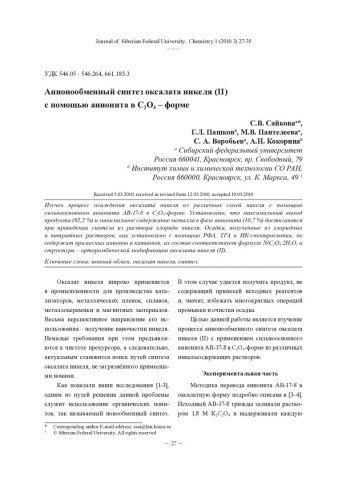 Библиографическое описание:Анионообменный синтез оксалата никеля (II) с помощью анионита в С[2]О[4] - форме = The Synthesis of Nickel Oxalate (II) by Use Anion Exchange AV-17-8 in С[2]О[4] - form / С. В. Сайкова, Г. Л. Пашков, М. В. Пантелеева [и др.]. - Текст : непосредственный // Журнал Сибирского федерального университета. Химия. - 2010. - Т. 3, № 1. - С. 27-35. - Библиогр.: с. 34 (11 назв.). - ISSN 1998-2836.