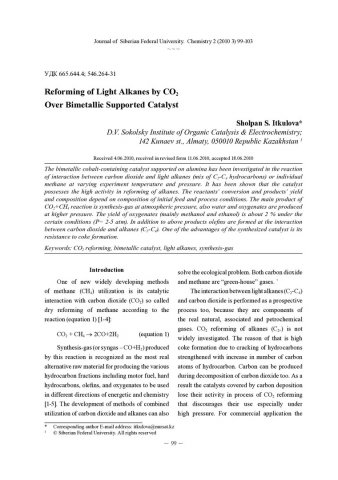 Библиографическое описание:Itkulova, S. S. Reforming of Light Alkanes by CO[2] Over Bimetallic Supported Catalyst = Риформинг легких алканов диоксидом углерода на биметаллическом нанесенном катализаторе / S. S. Itkulova. - Текст : непосредственный // Журнал Сибирского федерального университета. Химия. - 2010. - Т. 3, № 2. - С. 99-103. - Библиогр.: с. 103 (9 назв.). - ISSN 1998-2836.