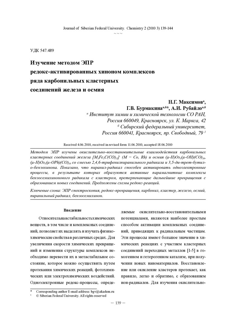 Библиографическое описание:Максимов, Н. Г. Изучение методом ЭПР редокс-активированных хиноном комплексов ряда карбонильных кластерных соединений железа и осмия = ESR study of redox activated quinine complexes of iron and osmium carbonyl cluster compounds / Н. Г. Максимов, Г. В. Бурмакина, А. И. Рубайло. - Текст : непосредственный // Журнал Сибирского федерального университета. Химия. - 2010. - Т. 3, № 2. - С. 139-144. - Библиогр.: с. 142 (12 назв.). - ISSN 1998-2836.