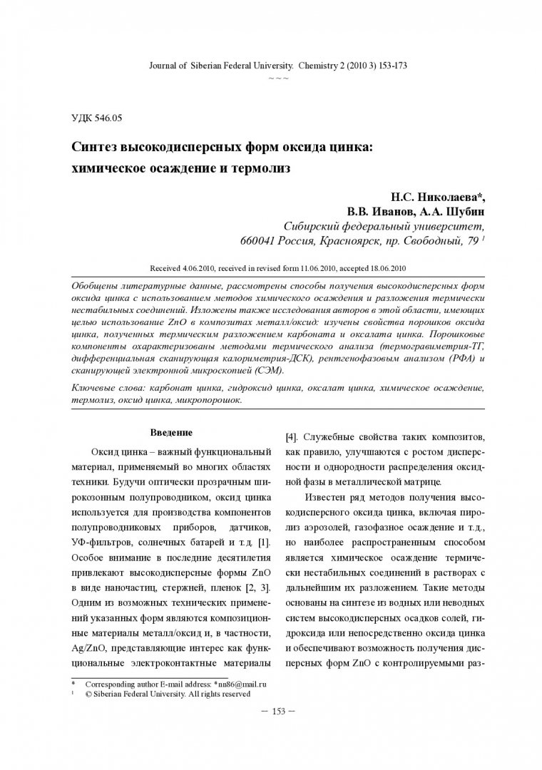 Библиографическое описание:Николаева, Н. С. Синтез высокодисперсных форм оксида цинка: химическое осаждение и термолиз = The Chemical Precipitation and Thermal Decomposition as the Way for Producing Ultrafine Zinc Oxide Forms / Н. С. Николаева, В. В. Иванов, А. А. Шубин. - Текст : непосредственный // Журнал Сибирского федерального университета. Химия. - 2010. - Т. 3, № 2. - С. 153-173. - Библиогр.: с. 170-172 (44 назв.). - ISSN 1998-2836.