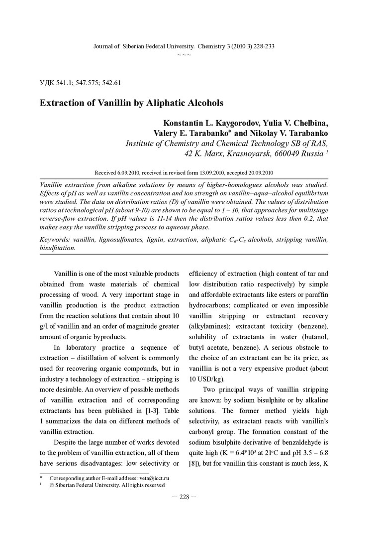 Библиографическое описание:Extraction of vanillin by aliphatic alcohols = Экстракция ванилина алифатическими спиртами / K. L. Kaygorodov, Y. V. Chelbina, V. E. Tarabanko, N. V. Tarabanko. - Текст : непосредственный // Журнал Сибирского федерального университета. Химия. - 2010. - Т. 3, № 3. - С. 228-233. - Библиогр.: с. 232-233 (13 назв.). - ISSN 1998-2836.