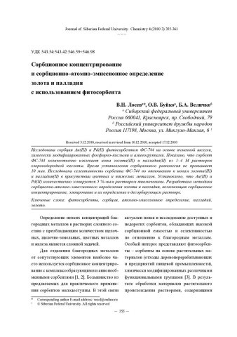 Библиографическое описание:Лосев, В. Н. Сорбционное концентрирование и сорбционно-атомно-эмиссионное определение золота и палладия с использованием фитосорбента = Sorption Preconcentration and Sorption-Atomic-Emission Determination of Gold and Palladium Using Phytosorbent / В. Н. Лосев, О. В. Буйко, Б. А. Величко. - Текст : непосредственный // Журнал Сибирского федерального университета. Химия. - 2010. - Т. 3, № 4. - С. 355-361. - Библиогр.: с. 359 (10 назв.). - ISSN 1998-2836.